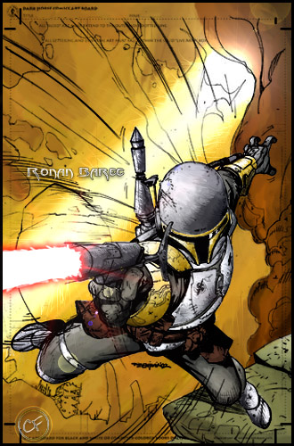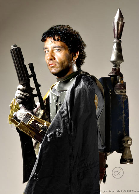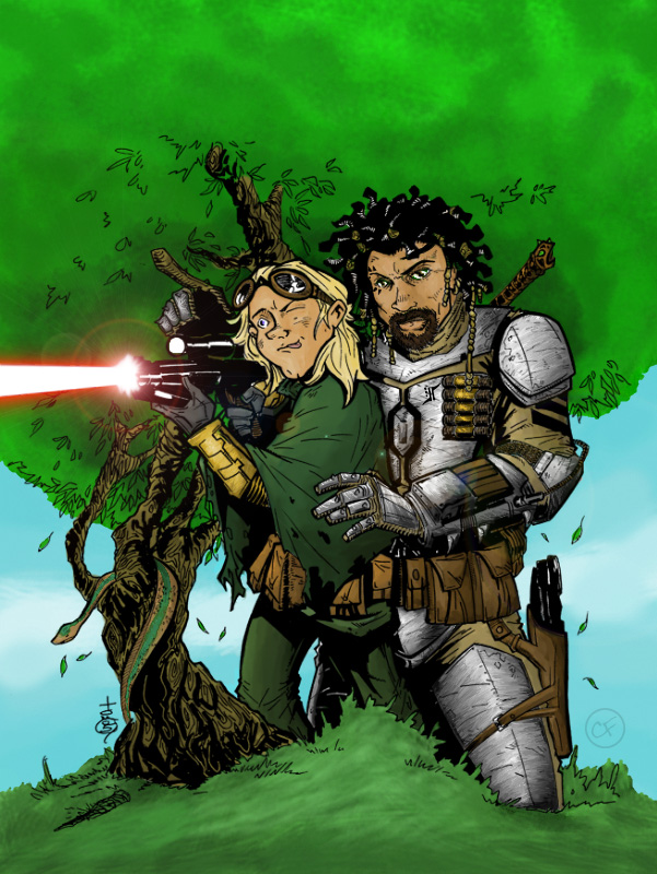 The first two showcase Ronan Barec with his armor of Honor Guard. The first one's a coloring, the second a photomanip of a Boba Fett fan costume. He doesn't really have an EE-3 or a coat like Boba Fett, but I couldn't edit that one out. The third one shows Altair Jiriad and his son, Skira, in an event prior to Runner. He had those scars erased by a medic and he tattooed the sigil of Clan Jiriad around his right eye, later. The image shows him without the traditional Kiffar paint. The artwork is a coloring of a lineart by great Tom Hodges.