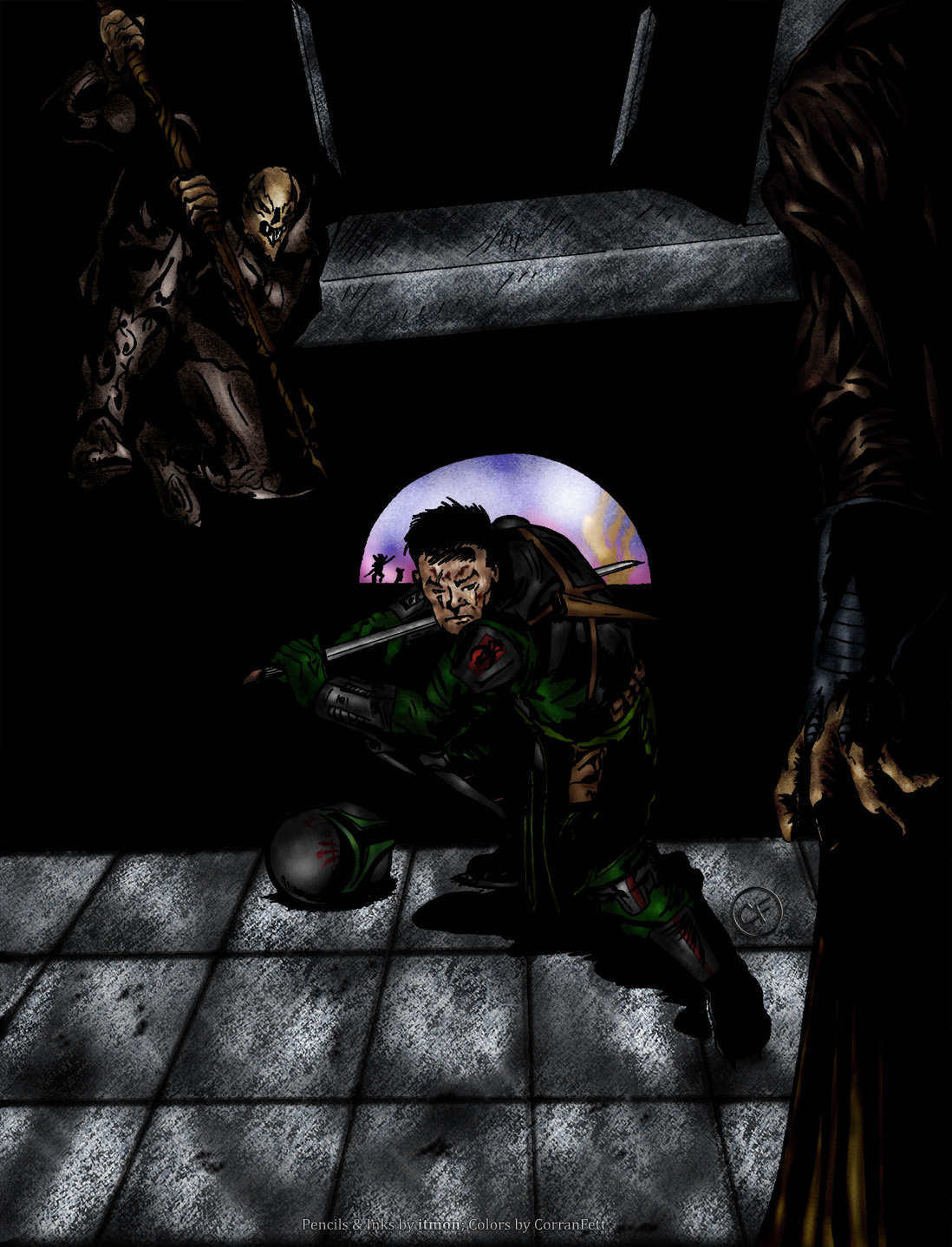 The fourth image shows Gladus Tite. Although this is also the cover image for Pariah, he got the scar in an event after Pariah, but the armor is the same mockup as in Pariah. This photomanip was created using promotional renders of the game Kane & Lynch. The second artwork of him, the one that shows him in full armor, is a coloring of a sketch by the amazing DarthKuk, and it shows Gladus in the armor and gear he acquired after the events of Pariah and he wears that in When Few Stood Against Many, the sequel to Honor Guard. The third artwork of Gladus shows him again, this time in battle against some Yuuzhan Vong in the late war, and he's shaved off his beard by then. The image itself is again colored by me, but the lineart was done by itmon, another awesome fan-artist who did this as a request for me, so pretty much all credit of that artwork goes to him.
